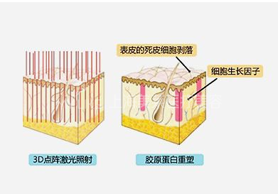 点阵激光采用的是点阵激光系统,利用该激光对组织的消融作用,可在皮肤上打出直径为120-1200微米的微孔,孔间距为500微米,这些微孔能在治疗后天内闭合,用肉眼也难以看见,很少出现渗液、出血和感染。