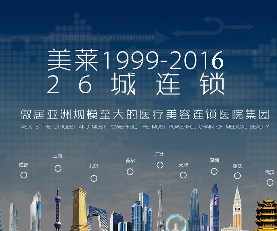 美莱医疗美容,行业公认医疗美容典范,国内成立较早、极具规模和国际影响力的医疗美容连锁机构。成立于1999年,多年来,已经在北京、上海、广州、首尔、深圳、杭州、成都、重庆、昆明、苏州、长沙等26个国际城市设立了医疗美容,是中国现代医疗美容产业奠基者,亚洲医疗美容知名品牌。