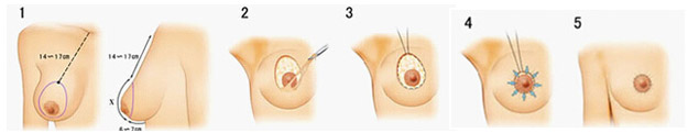 乳头楔形切除术:如乳头仅某一局部突出,无特别肥大,可行单块切除。如乳头较大,但形态圆整,仅切一侧易造成乳头歪斜,可做分区域间隔多块楔形切除术。将乳头分成六个区域,对其中间隔的三个区域行楔形切除。