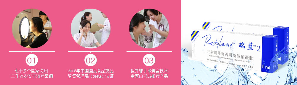 作为同时获得食品药物管理局(FDA)和食品药品监督管理总局(CFDA)批准的透明质酸填充剂品牌,瑞蓝®(Restylane®)1996年上市至今,已在超过70个和地区积累了逾2000万安心使用案例,美化面部轮廓、祛除面部皱纹,使人感觉更年轻,并获得了广泛的临床认证,被公认为医学美容行业的革命性产品。